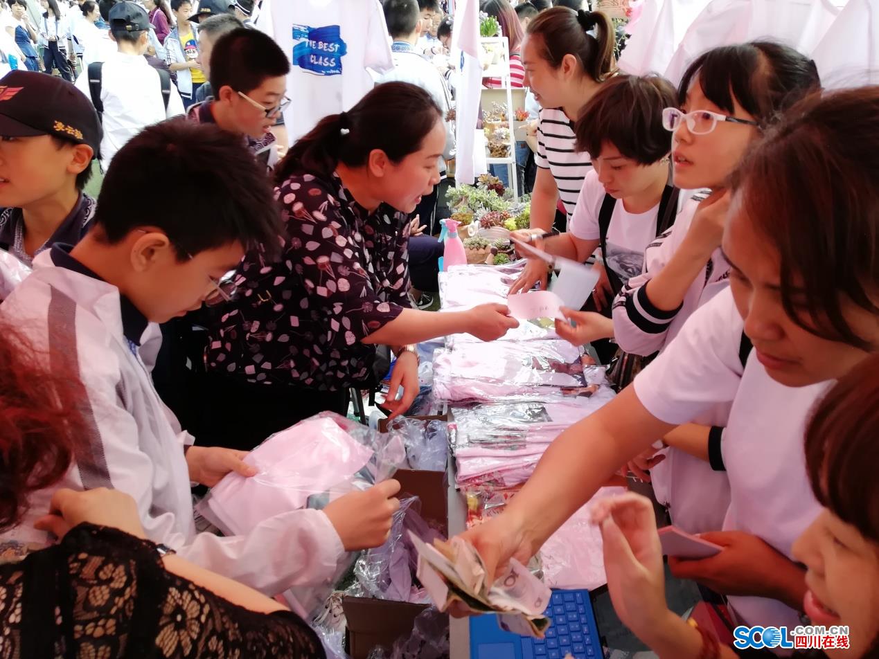 在初一(41)班的“璀璨之星,限量發(fā)行區(qū)”更是人潮涌動(dòng),前來(lái)購(gòu)買印有教師頭像T恤的顧客排起了長(zhǎng)隊(duì),紛紛前來(lái)挑選“特價(jià)老師”。“今天68元一件,明天就98元了,趕緊哦!”