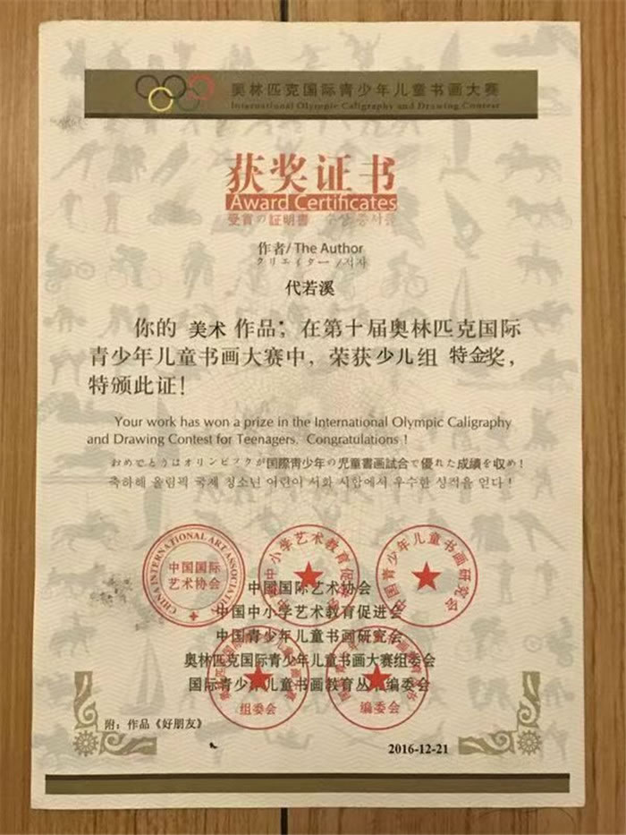 在黃女士的家里,不論是客廳還是臥室,都掛著許多大大小小被裱起來的畫作,這些畫作的作者都是小若溪,從繪畫到題字都是她一個人。此外,黃女士還向記者展示了小若溪的部分獎狀,其中包括奧林匹克國際青少年兒童書畫大賽特金獎、第七屆國際書畫大賽銀獎等國際書畫獎項。