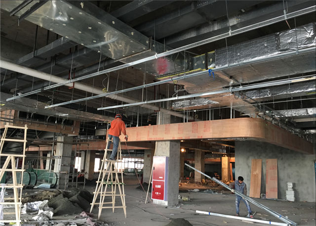 1、時尚百貨:一、二層公共區(qū)域吊頂正在安裝吊頂龍骨、做吊頂造型,三、四、五層公共區(qū)域吊頂封板完畢。二層商鋪內(nèi)正在粘貼地磚,安裝頂面龍骨、做吊頂造型。
