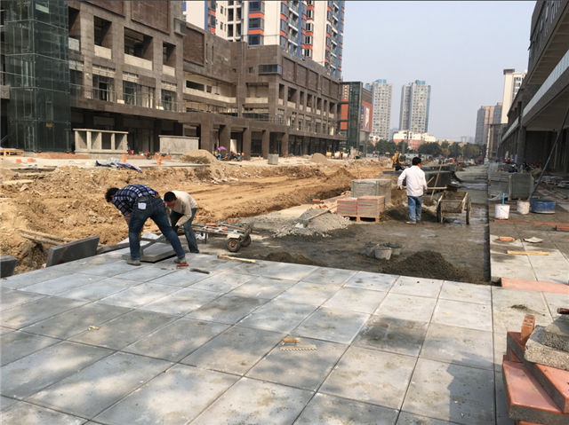 7、室外附屬:居然之家主入口室外附屬全部完成;時尚百貨及弘光路一側(cè)廣場大面積石材鋪貼完成,8#、9#樓一側(cè)室外鋪裝區(qū)域正在做石材面層粘貼。居然之家四層屋面鋪裝及綠化施工完畢。A、B區(qū)中間市政道路正在進行開挖、埋管施工中。