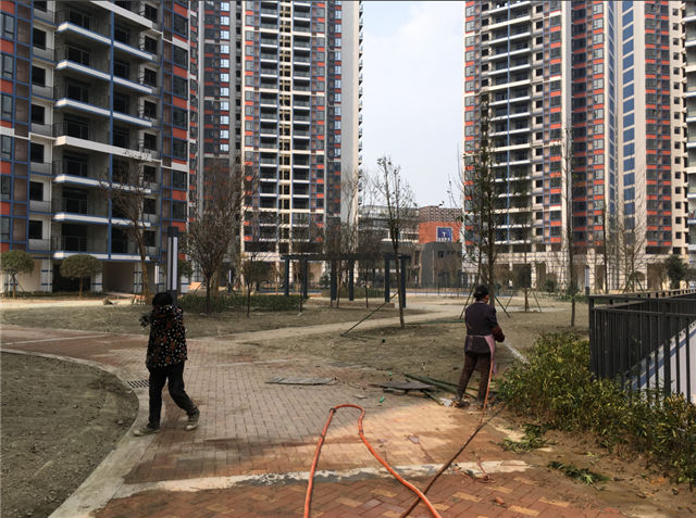 6、室外附屬:小區(qū)內(nèi)人行道區(qū)域面層粘貼全部完成,喬木、灌木已種植,綠化帶內(nèi)開始種植綠籬。小區(qū)外圍正在做面層鋪貼施工。